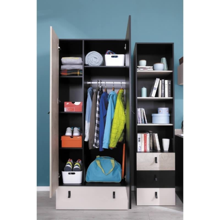 Za dwudrzwiowym frontem skryto drążek na wieszaki, cztery pojemne półki oraz pojedynczą szufladę w dolnej części. Taki układ umożliwia przechowywanie zarówno ubrań wymagających powieszenia, jak i rzeczy składanych czy drobnych akcesoriów. Rozmieszczenie elementów wewnętrznych ułatwia utrzymanie porządku i pozwala maksymalnie wykorzystać każdy centymetr przestrzeni.