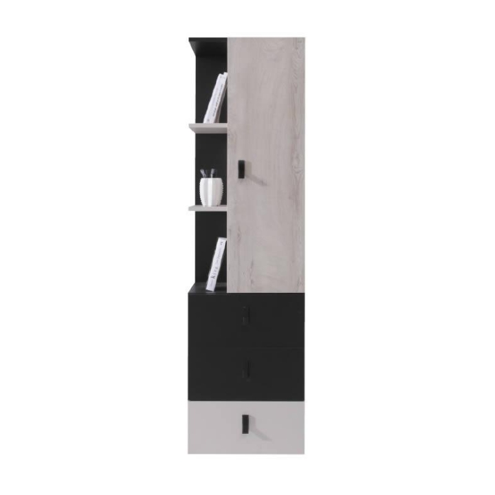 Korpus regału utrzymany w kolorystyce dębu i czerni stanowi solidną podstawę dla zróżnicowanych frontów, tworząc kompozycję pełną wizualnej głębi. Konstrukcja z płyty meblowej zapewnia trwałość i odporność na codzienne użytkowanie. Dzięki kompaktowym wymiarom mebel z łatwością odnajduje się w mniejszych pomieszczeniach, takich jak pokój młodzieżowy, salon, gabinet czy korytarz, oferując zarówno miejsce na przechowywanie, jak i element dekoracyjny wnętrza.