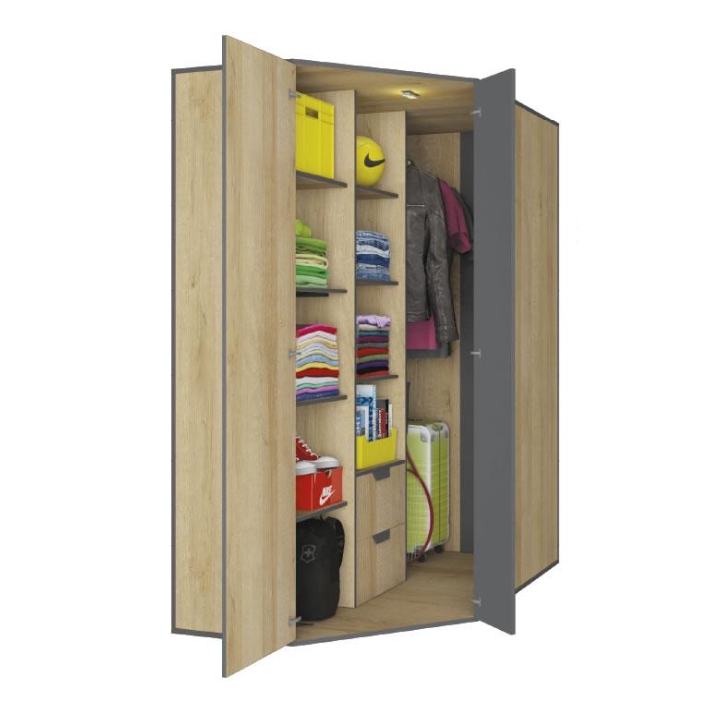 Układ lewostronny umożliwia ustawienie szafy w narożniku, co znacząco wpływa na efektywne wykorzystanie powierzchni. Taki kształt pozwala na zachowanie swobodnego dostępu do wszystkich przegród, a jednocześnie porządkuje przestrzeń w pomieszczeniu. Model ten doskonale sprawdzi się w sypialni, pokoju młodzieżowym czy garderobie, tworząc spójną kompozycję z innymi meblami o nowoczesnym lub klasycznym charakterze.