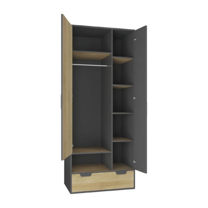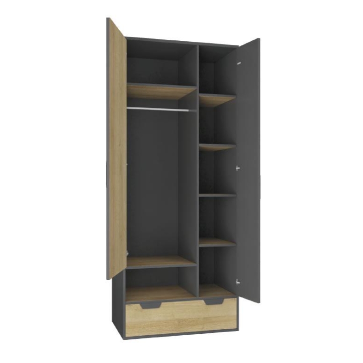 Szafa Nano NA2 marki Meblar to propozycja dla osób ceniących przemyślane rozwiązania i nowoczesny charakter wnętrz. Korpus o wysokości 195 cm, szerokości 80 cm i głębokości 50 cm zapewnia optymalne wykorzystanie przestrzeni przy zachowaniu zwartej formy. Dwudrzwiowa konstrukcja przyciąga uwagę nieoczywistym kontrastem – jedno skrzydło zachowuje strukturę dębu, drugie utrzymane jest w grafitowej barwie, tworząc ciekawy efekt wizualny.