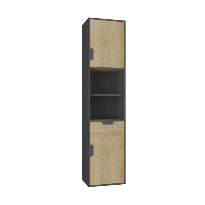 W górnej części znajduje się zamykana szafka z frontem w odcieniu dębu, wewnątrz której umieszczono jedną półkę. Poniżej zaprojektowano otwartą wnękę z dodatkową półką, idealną do wyeksponowania książek, roślin czy dekoracyjnych akcentów. Kolejny segment to pojemna szuflada, a w dolnej części mebla umieszczono kolejną zamykaną przestrzeń z jedną półką, pozwalającą ukryć przedmioty, które powinny pozostać poza zasięgiem wzroku.