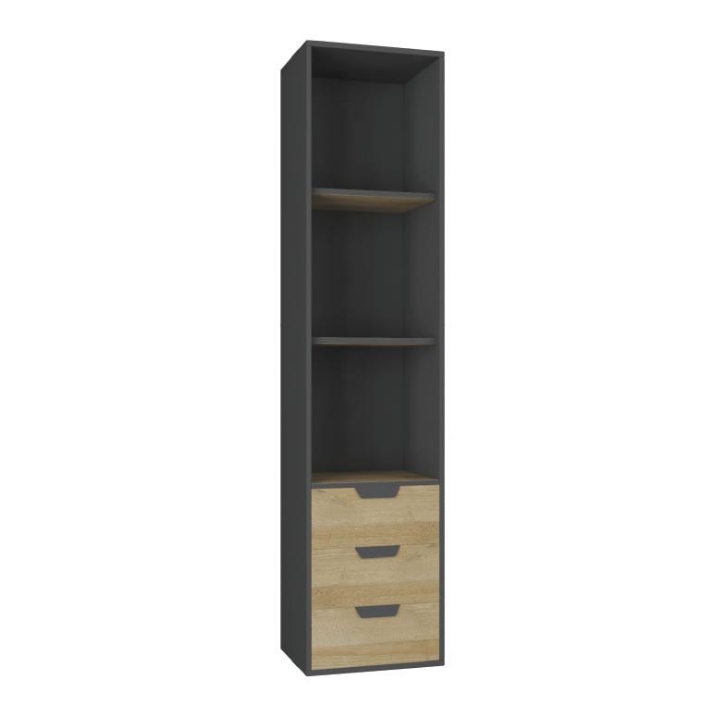 W górnej części umieszczono otwartą wnękę z dwiema półkami, stanowiącymi idealne miejsce na książki, rośliny lub elementy dekoracyjne. Niżej znajduje się segment z trzema szufladami o równej wielkości, utrzymanymi w ciepłym odcieniu dębu, co pozwala przechowywać drobniejsze przedmioty w uporządkowany sposób. Wewnętrzne ścianki w tonacji grafitu tworzą wyrazisty kontrast z jasnym odcieniem drewna, podkreślając nowoczesny charakter bryły.