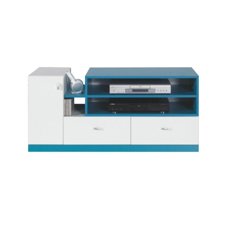 Z jednej strony znajduje się szafka ukryta za pełnym, białym frontem – idealna do przechowywania kabli, gier czy płyt, które nie muszą być na widoku. Obok, w górnej części, zaprojektowano intensywnie niebieską wstawkę z otwartą półką, stanowiącą doskonałe miejsce na dekoder, konsolę lub odtwarzacz. Dolny segment uzupełniają dwie pojemne szuflady z białymi frontami, w których można schować piloty, dokumenty, filmy czy inne drobne akcesoria.