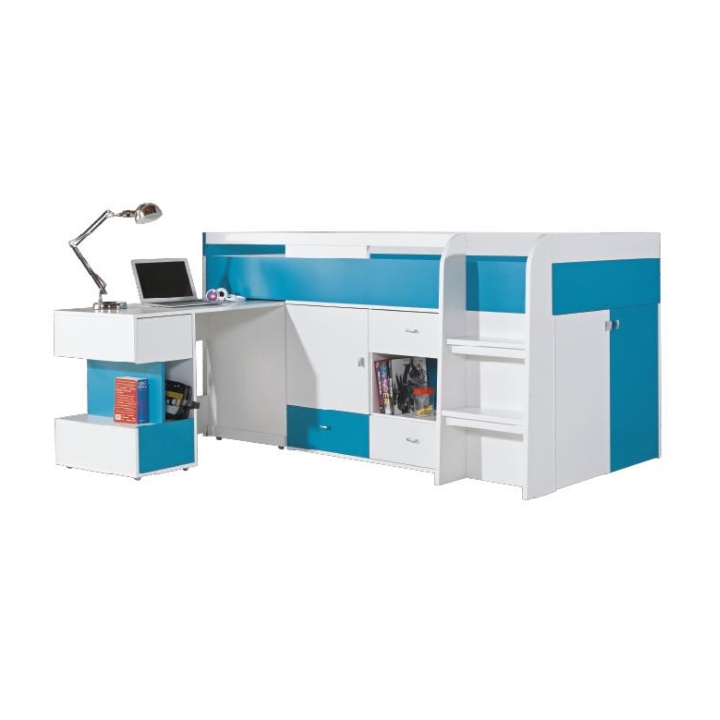 Integralną część zestawu stanowi biurko z dwoma szufladami, zapewniające komfortowe miejsce do nauki, pracy czy kreatywnych zajęć. Całość utrzymano w starannie zaplanowanej biało-niebieskiej kolorystyce, która wprowadza do wnętrza świeżość i nowoczesny charakter, a jednocześnie ułatwia zestawienie mebla z różnymi dodatkami.
