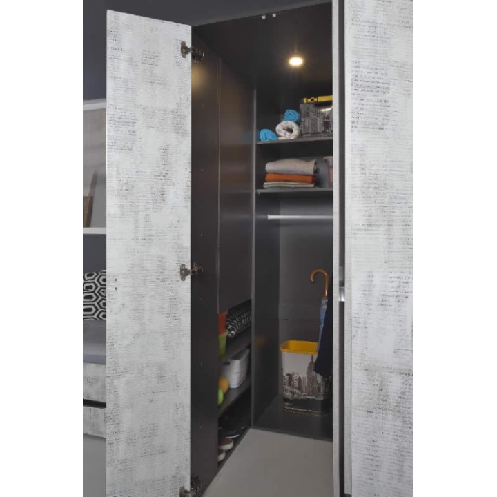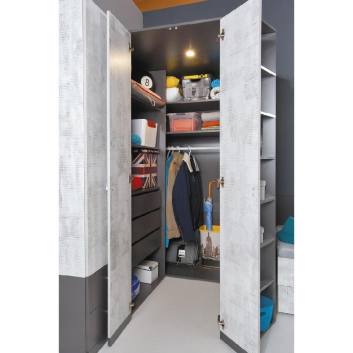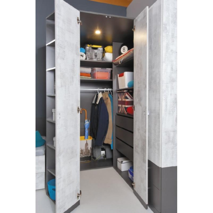 Szaro-grafitowe wykończenie dodaje meblowi świeżości i łatwo wpasowuje się w nowoczesne aranżacje pokoju młodzieżowego. Szary odcień ,,Enigma" to delikatne, jasnoszare wybarwienie o unikalnym nadruku. Korpus i fronty wykonane są z solidnej płyty meblowej, która zapewnia stabilność konstrukcji i ułatwia utrzymanie czystości na co dzień.