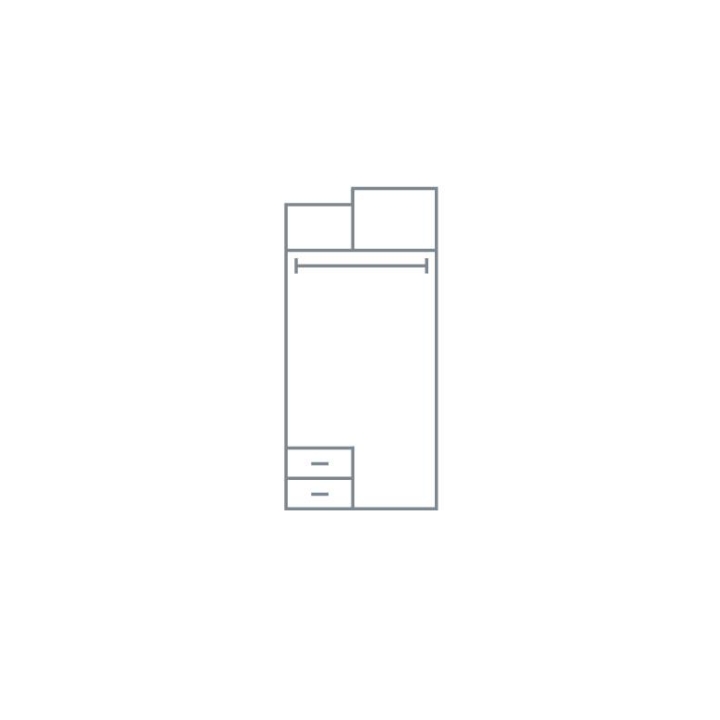 Front tworzą dwa niesymetryczne skrzydła: jedno w szarym wykończeniu z delikatnym nadrukiem, drugie w odcieniu grafitu, co nadaje całości dynamiczny charakter. Za drzwiami kryje się górna półka na ubrania składane, pościel lub akcesoria oraz drążek do wieszania koszul, sukienek czy marynarek. W dolnej części, pod grafitowym skrzydłem, umieszczono dwie szuflady, również w grafitowym tonie.