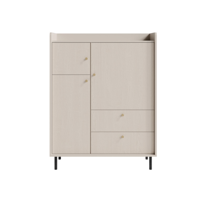 Komoda Grande GR1 marki Meblar to ponadczasowy element wyposażenia utrzymany w tonacji beżu piaskowego, który wprowadza do wnętrza subtelne ciepło. Jej konstrukcja o wysokości 133 cm, szerokości 104 cm i głębokości 42 cm pozwala nie tylko na wygodne przechowywanie, lecz także na ekspozycję dekoracji, oświetlenia lub osobistych pamiątek na górnym blacie. Całość zachowuje lekkość dzięki smukłym, czarnym nóżkom, które dodają konstrukcji charakteru.