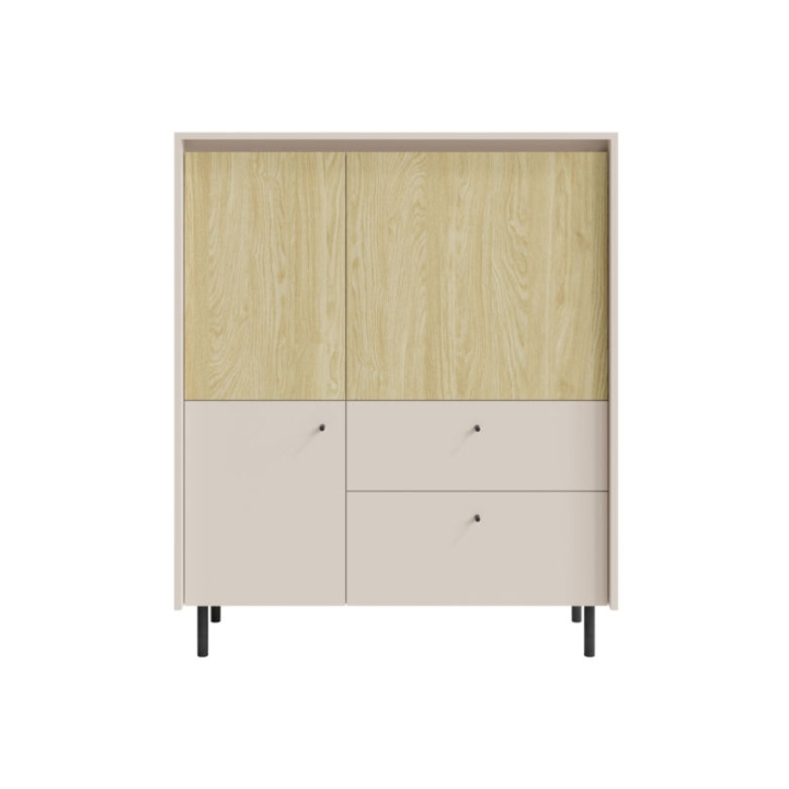 Za trzema frontami kryją się pojemne wnętrza, w których zmieszczą się większe przedmioty — od porcelany po zapas pościeli. Dodatkowo dwie szuflady w centralnej części pozwalają uporządkować drobiazgi, dokumenty czy akcesoria codziennego użytku. Korpus w piaskowym odcieniu współgra z frontami o fakturze dębu, tworząc spójną, wyważoną kompozycję. Czarne, smukłe nóżki dodają całości lekkości oraz nuty współczesnego charakteru.