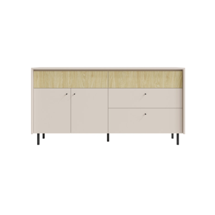 Komoda Malta ML6 marki Meblar utrzymana jest w odcieniu piaskowego beżu, uzupełnionej subtelną wstawką w odcieniu dębu w górnej części frontów. Wyważone proporcje i stonowana kolorystyka wprowadzają do wnętrza ciepły, naturalny nastrój.