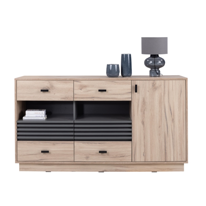 Konstrukcja obejmuje sześć szuflad - cztery z frontami w kolorze dębu i dwie z antracytowymi, ozdobnymi panelami – co zapewnia wiele możliwości przechowywania odzieży, dokumentów czy akcesoriów. Dwie otwarte wnęki doskonale nadają się do eksponowania książek, ozdób lub sprzętu elektronicznego. Po prawej stronie znajduje się szafka z pełnym dębowym frontem, wewnątrz której ukryto dwie półki idealne na rzadziej używane przedmioty.