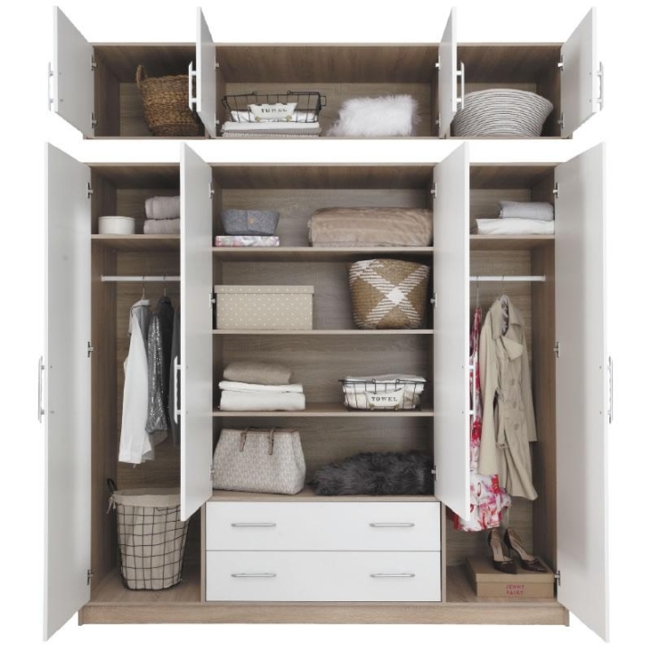 Cztery drzwi prowadzą do wnętrza podzielonego na praktyczne strefy. W centralnej części znajdują się trzy szerokie półki oraz dwie obszerne szuflady, idealne na bieliznę, dodatki czy drobne przedmioty. Po bokach umieszczono po jednej półce i drążku, co pozwala swobodnie wieszać koszule, płaszcze czy sukienki. Na dwóch środkowych frontach wkomponowano duże lustro, które optycznie powiększa przestrzeń i pozwala szybko sprawdzić strój przed wyjściem.