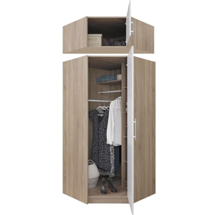 Szafa Smart SR4 w wersji prawej marki Meblar to narożne rozwiązanie stworzone z myślą o maksymalnym wykorzystaniu dostępnej przestrzeni, szczególnie w pokojach o ograniczonym metrażu. Wysokość 190 cm, szerokość 95 cm i głębokość 95 cm tworzą bryłę, która wpasowuje się w róg pomieszczenia, porządkując całość i nie zabierając centralnej części pokoju.