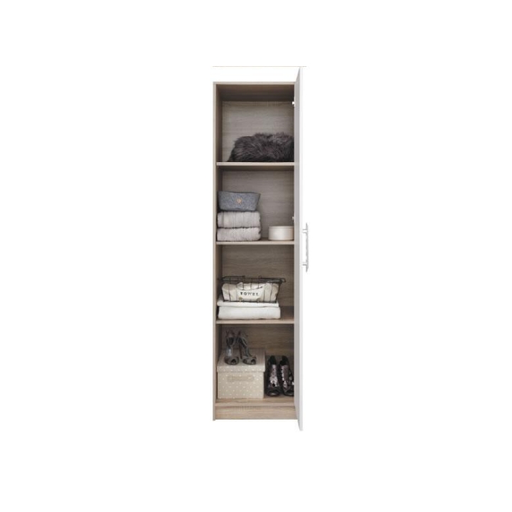 Jednodrzwiowa konstrukcja skrywa trzy pojemne półki, które pozwalają wygodnie rozdzielić odzież, obuwie, tekstylia domowe czy akcesoria sezonowe. Gładkie fronty w kaszmirowym odcieniu nadają meblowi spokojny, stonowany charakter, a subtelny czarny uchwyt dodaje delikatnego kontrastu i ułatwia otwieranie drzwi.