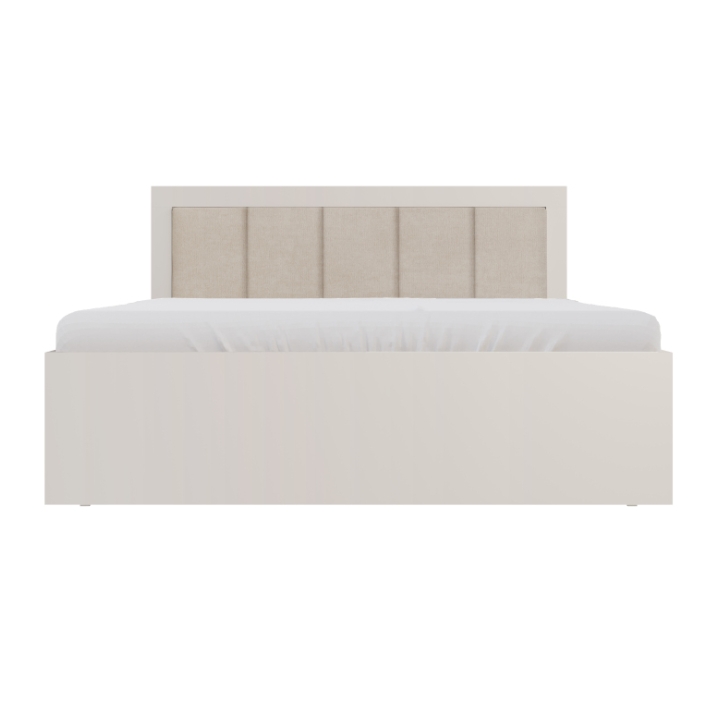Wezgłowie częściowo wykończono miękką tapicerką w beżowym, naturalnym odcieniu, co dodaje przytulności i zapewnia wygodne oparcie podczas czytania lub wieczornego relaksu. W zestawie znajduje się metalowy stelaż z mechanizmem podnoszenia, umożliwiający łatwy dostęp do dużego pojemnika ukrytego pod materacem – idealnego na pościel, koce czy sezonowe tekstylia.