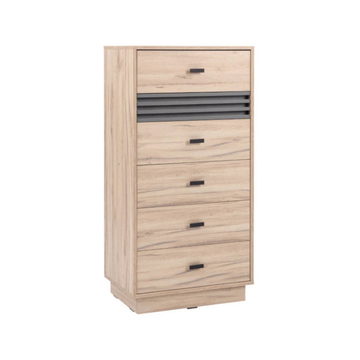 Całość tworzy sześć szuflad, które pozwalają na wygodne posegregowanie ubrań, akcesoriów czy dokumentów. Jedna z nich wyróżnia się antracytowym frontem i jest nieco mniejsza, co wprowadza subtelny element dekoracyjny i przełamuje jednolitą linię jasnego dębu. Smukła sylwetka ułatwia ustawienie mebla w wąskim korytarzu, sypialni lub domowym biurze.