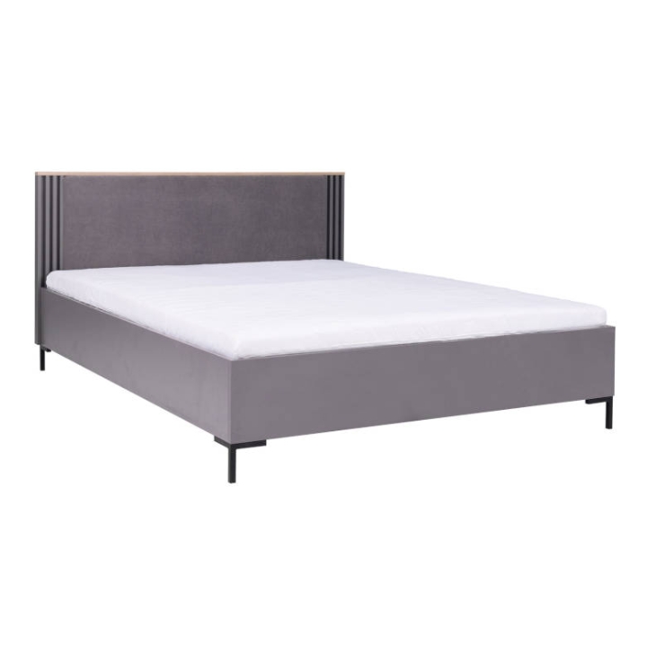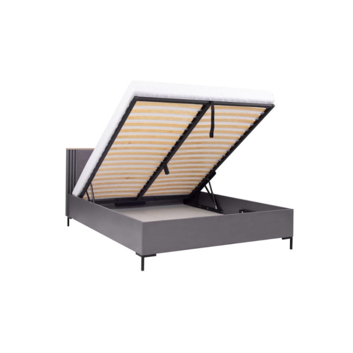 Korpus i front w kolorze antracytu tworzą spójną całość, która wprowadza do sypialni nowoczesny, stonowany charakter i łatwo komponuje się z różnymi odcieniami ścian czy dodatków. W zestawie znajduje się metalowy stelaż z podnośnikiem, dzięki któremu dostęp do schowka pod materacem jest szybki i wygodny – miejsce to sprawdza się na kołdry, poduszki lub sezonowe tekstylia.