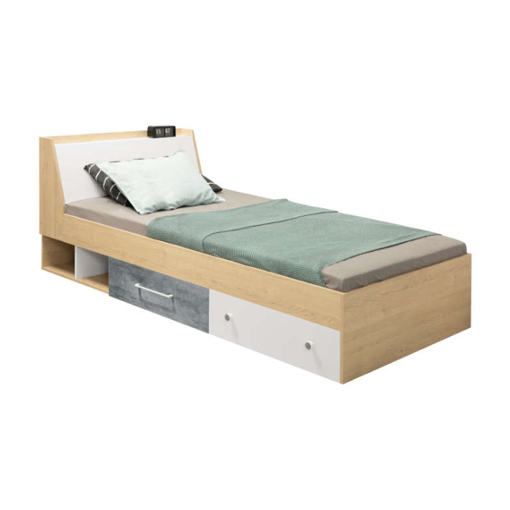 Dolna część mebla została wyposażona w dwie obszerne szuflady z frontami w kolorze białym oraz szarym betonowym, które wprowadzają subtelne zróżnicowanie kolorystyczne. Dodatkowo znajdują się tam otwarte półki, stanowiące doskonałe miejsce na drobiazgi. Zagłówek skrywa otwierany schowek, idealny do przechowywania dodatkowych przedmiotów, dzięki czemu wszystkie niezbędne rzeczy można mieć zawsze w zasięgu ręki.