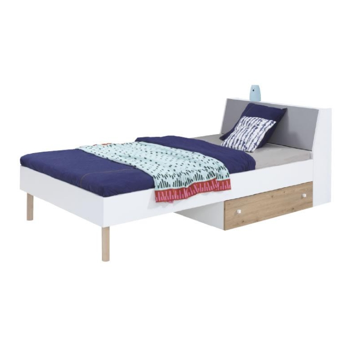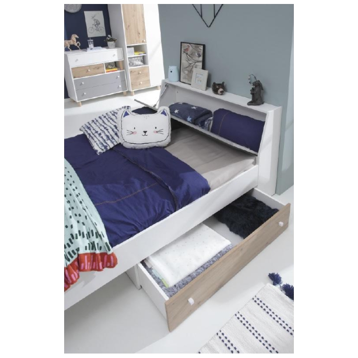 Prawa część łóżka została wyposażona w pojemną szufladę z frontem w dekorze dębowym, która doskonale sprawdza się jako miejsce na przechowywanie pościeli, koców lub ubrań sezonowych. Przemyślane rozmieszczenie elementów sprzyja zachowaniu ładu, pozwalając ograniczyć liczbę dodatkowych mebli w pokoju. System wysuwu działa płynnie i bezgłośnie, co przekłada się na wygodę codziennego użytkowania.