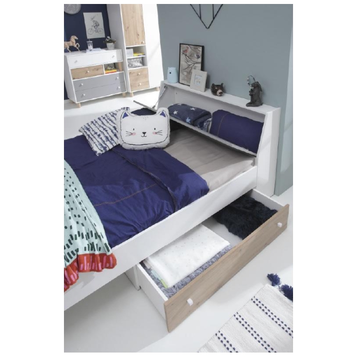 W wariancie prawym łóżko wyposażono w rozbudowaną część boczną z przestronną szufladą wykończoną frontem w odcieniu dębu po stronie prawej. Element ten pozwala wygodnie przechowywać pościel, ubrania lub inne tekstylia, dzięki czemu przestrzeń wokół pozostaje uporządkowana. Subtelne połączenie barw sprawia, że mebel staje się wyrazistym, lecz nie przytłaczającym akcentem wystroju.