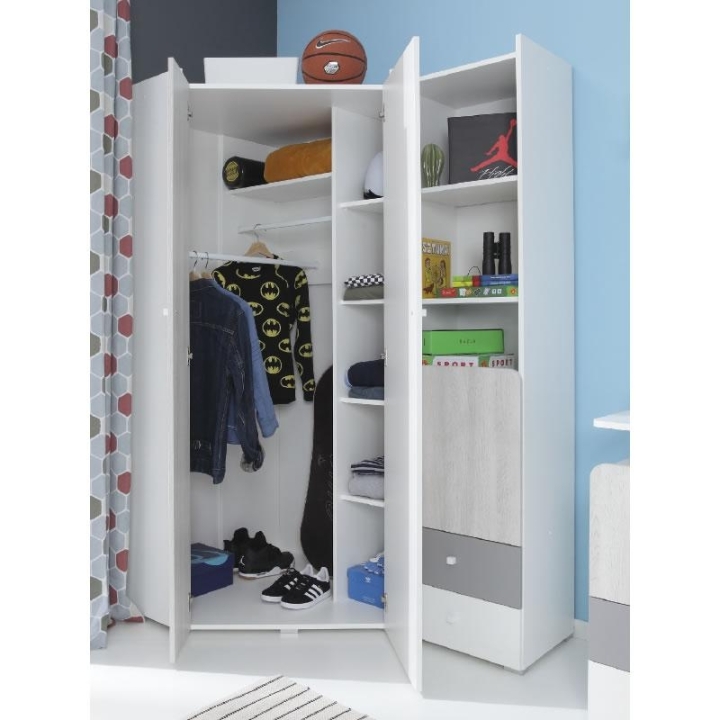 Wersja lewa modelu Como CM2 oznacza, że rozbudowana część szafy znajduje się po lewej stronie, co pozwala dopasować ją do konkretnego układu pokoju. Całość wykonano z trwałej płyty meblowej, odpornej na codzienne użytkowanie i łatwej w pielęgnacji – wystarczy przetrzeć powierzchnię miękką ściereczką. Solidne zawiasy zapewniają płynne otwieranie drzwi, a konstrukcja mebla czyni go znakomitym wyborem zarówno jako główną garderobę, jak i uzupełnienie większego zestawu mebli z kolekcji Como.