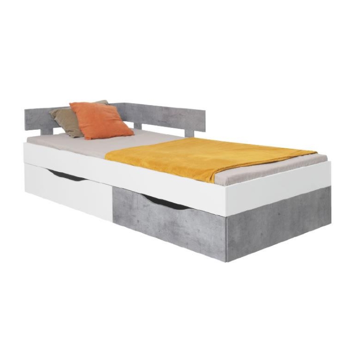 Zróżnicowana kolorystyka frontów dodaje meblowi wyrazistości, wprowadzając subtelny akcent o nowoczesnym charakterze. Dekoracyjne wezgłowie z wstawką w tonacji jasnego betonu nadaje bryle współczesny wygląd i delikatnie ożywia jej formę. Biało-betonowe wykończenie sprawia, że łóżko doskonale komponuje się z wnętrzami urządzonymi w duchu minimalizmu lub skandynawskiej prostoty.