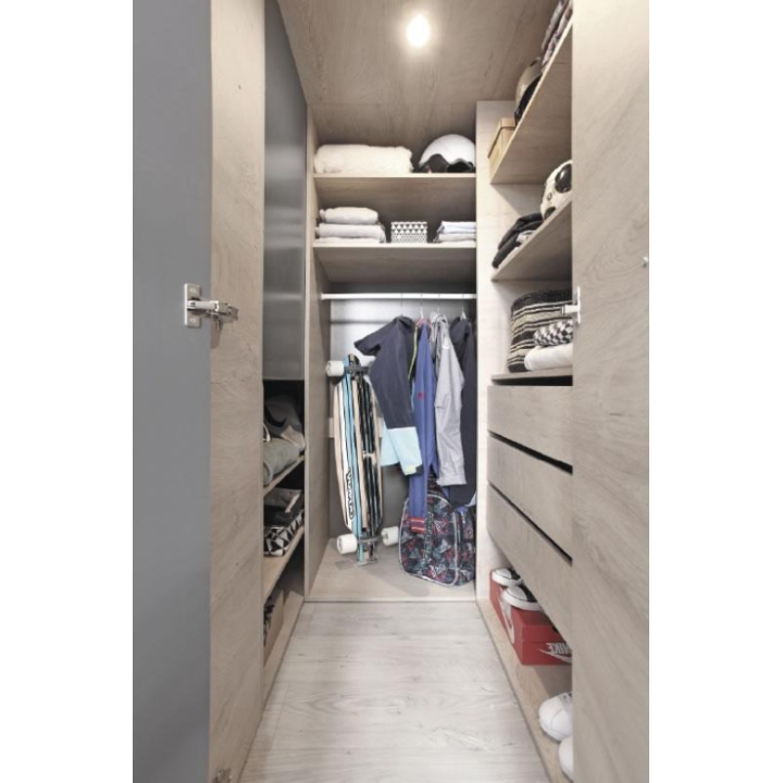 Wnętrze mebla kryje drążek na ubrania, zestaw pojemnych półek oraz trzy szuflady, które pozwalają na logiczne rozmieszczenie garderoby, dodatków i tekstyliów. Dwuskrzydłowe fronty otwierają się lekko i płynnie, gwarantując swobodny dostęp do całego wnętrza. Całość została przemyślana w taki sposób, by umożliwić utrzymanie ładu nawet przy intensywnym użytkowaniu.