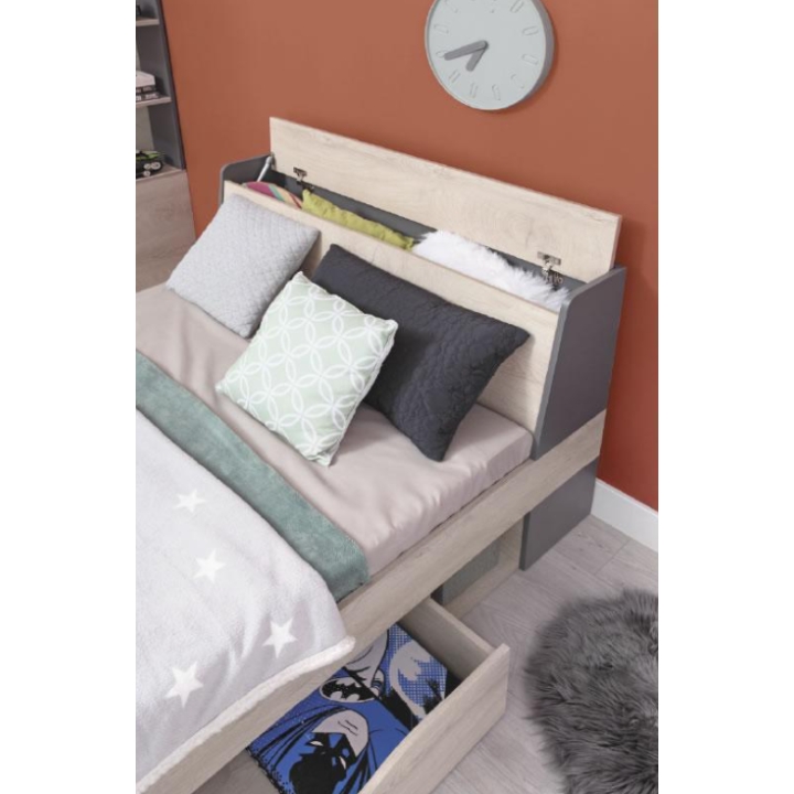 Pod częścią z materacem znajdują się dwie pojemne szuflady oraz otwarta wnęka, które pomagają w utrzymaniu porządku i pozwalają wykorzystać każdy centymetr przestrzeni. Schowki doskonale sprawdzają się jako miejsce na pościel, odzież sezonową czy inne akcesoria codziennego użytku. Dodatkowo w zagłówku umieszczono dyskretny pojemnik, idealny na drobiazgi, które warto mieć zawsze w zasięgu ręki.