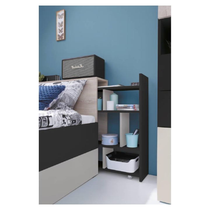 Połączenie kolorów dębu, beżu i czerni podkreśla nowoczesny charakter bryły. Płyta meblowa zapewnia stabilność i trwałość, a przemyślany rozkład elementów pozwala wykorzystać każdy centymetr dostępnej przestrzeni. Planet PL14 w wersji lewej tworzy w sypialni lub pokoju młodzieżowym nie tylko miejsce do wypoczynku, lecz także praktyczny punkt organizacji, łącząc wygodę snu z funkcją przechowywania w spójnym, nowoczesnym stylu.