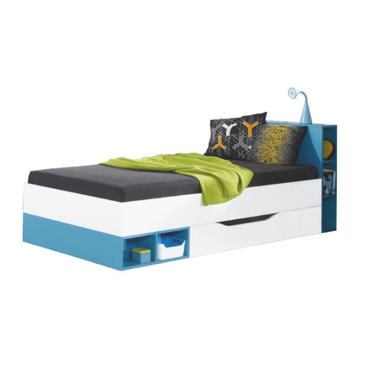 W dolnej części mebla umieszczono pojemną szufladę z białym frontem, która pomieści pościel, koce lub dodatkowe tekstylia. Korpus w białym kolorze został urozmaicony intensywnie niebieskimi elementami, nadającymi całości świeży, nowoczesny charakter. Dodatkowe niebieskie wstawki znajdują się pod materacem oraz za zagłówkiem, gdzie tworzą praktyczne półki idealne na drobiazgi, książki lub dekoracje. Solidna płyta meblowa gwarantuje stabilność i trwałość, a gładkie powierzchnie są łatwe w pielęgnacji.
