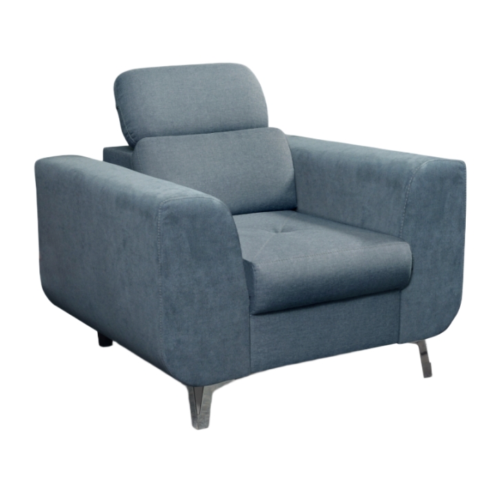 Geometryczna forma fotela uzupełniona została o szerokie podłokietniki i wysokie oparcie, co sprzyja wygodzie użytkowania. Regulowany zagłówek pozwala na dostosowanie pozycji do indywidualnych potrzeb, a pikowane siedzisko nadaje całości nowoczesnego wyglądu. Mebel doskonale sprawdzi się zarówno w przestronnych, jak i bardziej kameralnych aranżacjach.