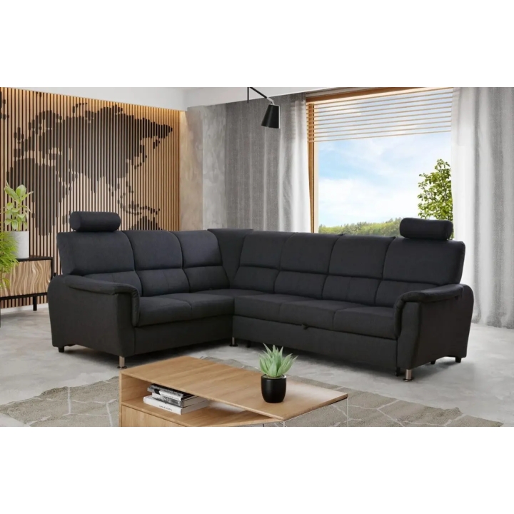 Model dostępny jest w wersji prawo i lewostronnej, dzięki czemu można dopasować go do układu wnętrza. Obszerna gama tkanin tapicerskich pozwala na wybór wybarwienia dopasowanego do aranżacji pomieszczenia. Całość osadzona jest na chromowanych nóżkach, które nadają meblowi nowoczesny charakter.