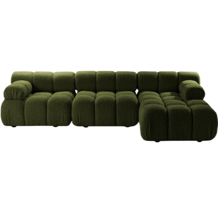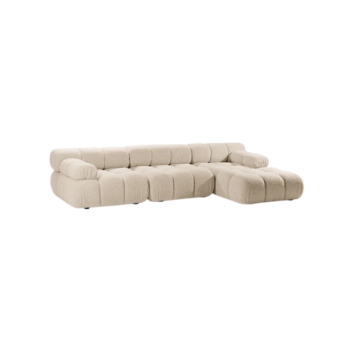 Forma narożnika opiera się na charakterystycznych, kulistych elementach, które łączą w sobie wizualną miękkość z wysoką sprężystością. Wyjątkowy wygląd mebla to zasługa licznych ozdobnych marszczeń na tapicerce oraz efektownych pionowych przeszyć, które akcentują jego nowoczesną, geometryczną formę. Za niezrównany komfort odpowiada wypełnienie z pianki poliuretanowej.