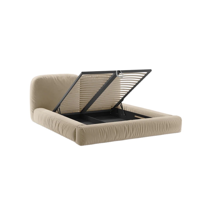 W konstrukcji mebla ukryto pojemnik na pościel, zajmujący całe wnętrze ramy pod stelażem. Zastosowanie mechanizmu z podnośnikami gazowymi pozwala na bezproblemowe uniesienie górnej części łóżka. Jest to bardzo pomocne w codziennej organizacji sypialni, dając dodatkowe miejsce na zapasowe koce, narzuty lub ubrania, które nie mieszczą się w szafie.