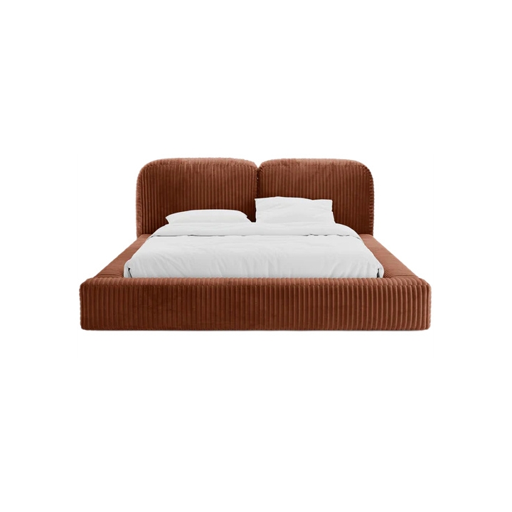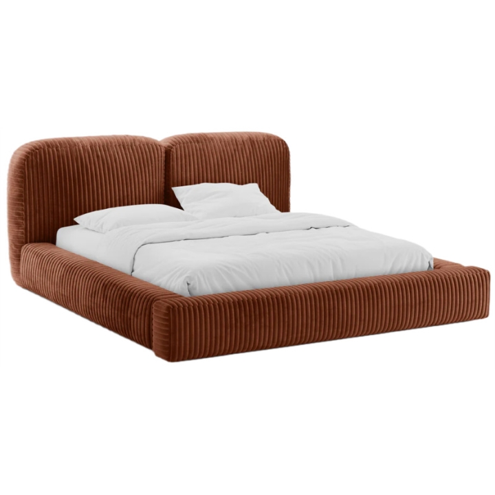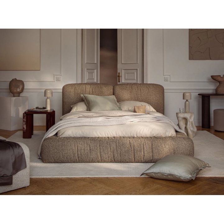 Elementem przyciągającym uwagę jest podwójne wezgłowie, utworzone przez dwa szerokie panele. Tworzą one miękką powierzchnię, o którą można się wygodnie oprzeć podczas czytania lub oglądania telewizji. Ramę materaca otacza puszysta i szeroka obudowa, która sprawia, że łóżko wygląda na lekkie, dając poczucie bezpieczeństwa i otulenia.