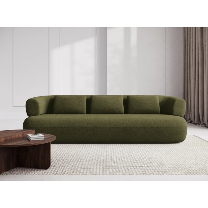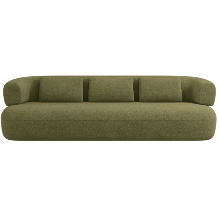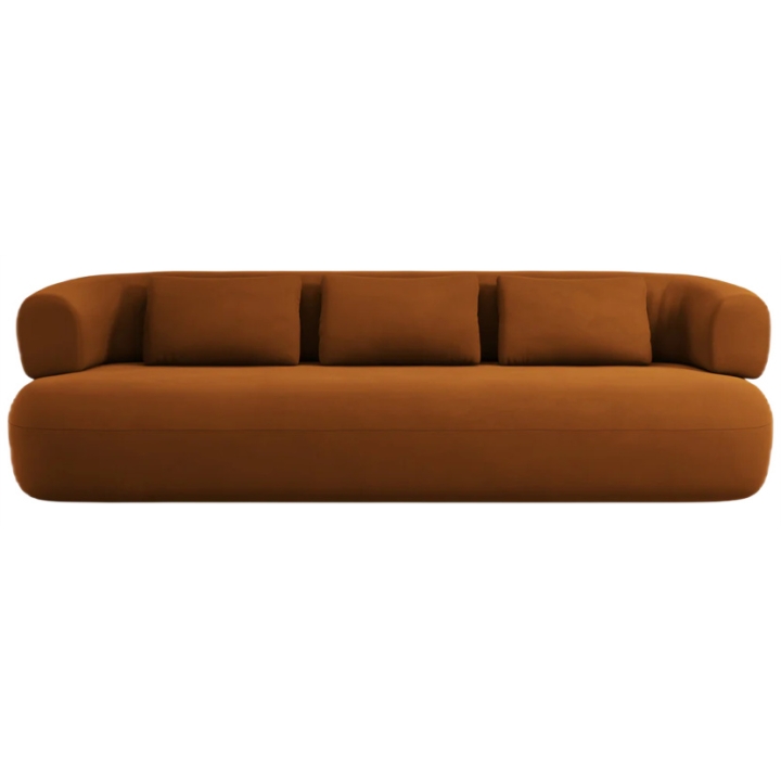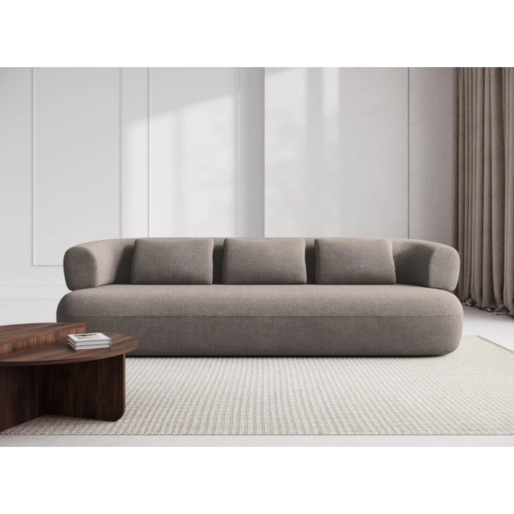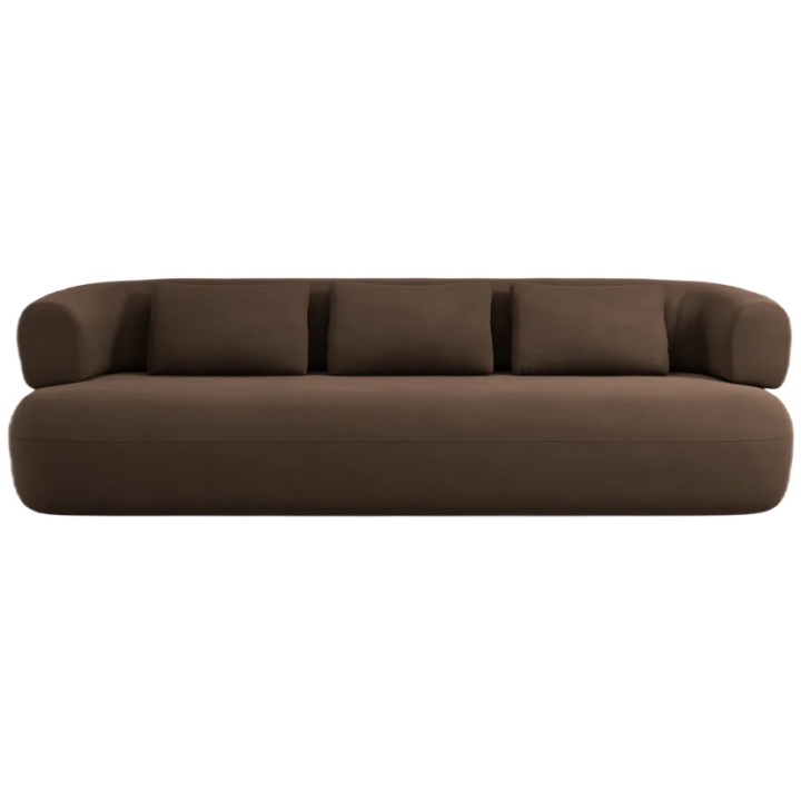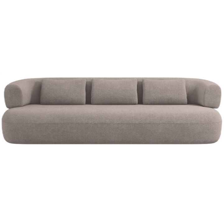 Zaokrąglona sylwetka oraz obłe krawędzie nadają jej nowoczesny wygląd, pasujący do współczesnych trendów opartych na organicznych kształtach. Sofa wyposażona jest w dodatkowe trzy poduszki oparciowe, które zwiększają komfort codziennego wypoczynku. Można je dowolnie układać lub całkowicie zdjąć, aby uzyskać więcej wolnego miejsca na siedzisku, zależnie od aktualnych potrzeb.