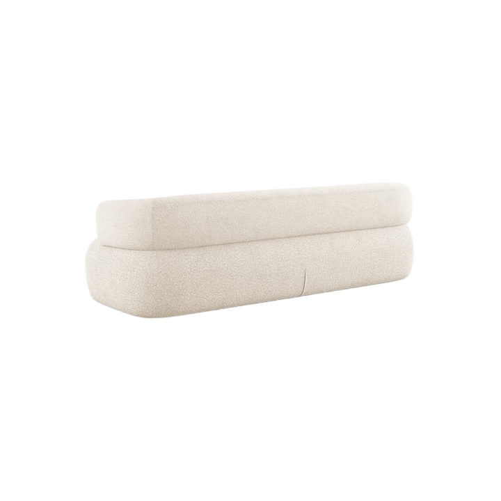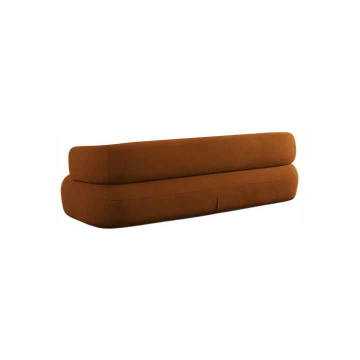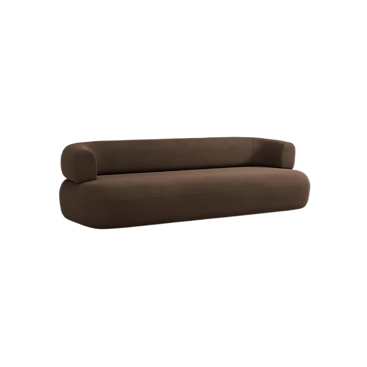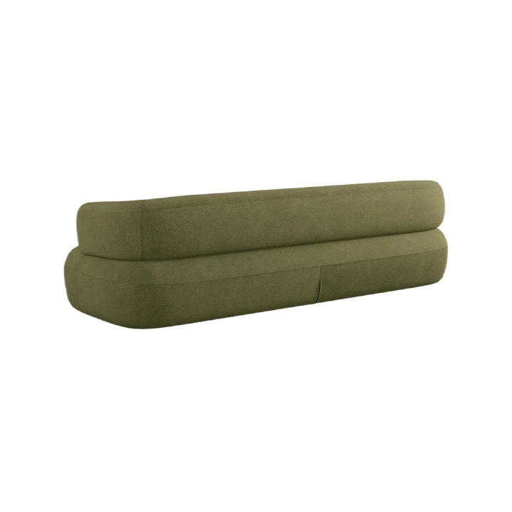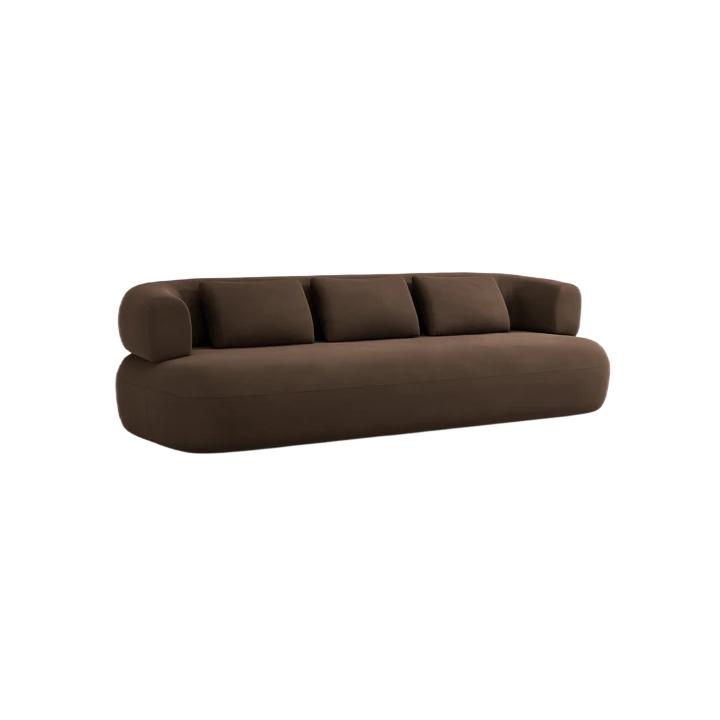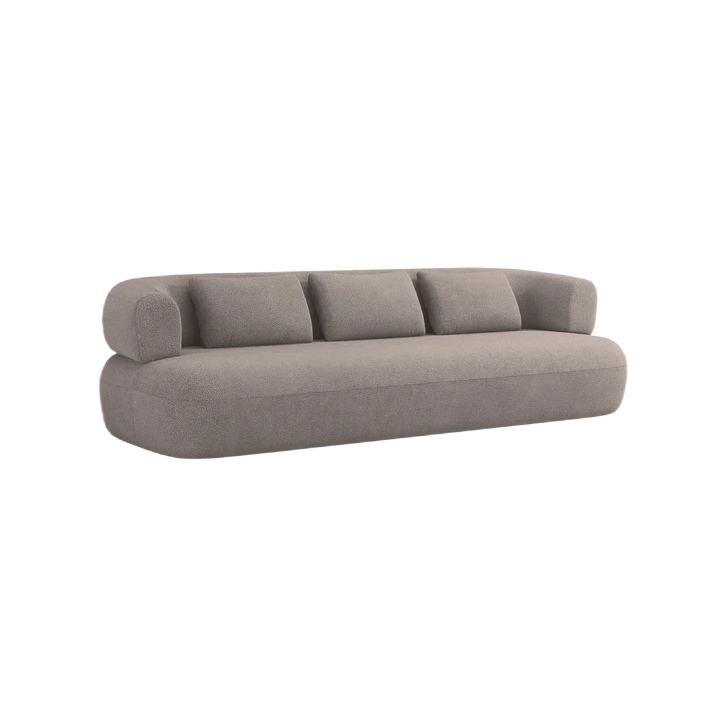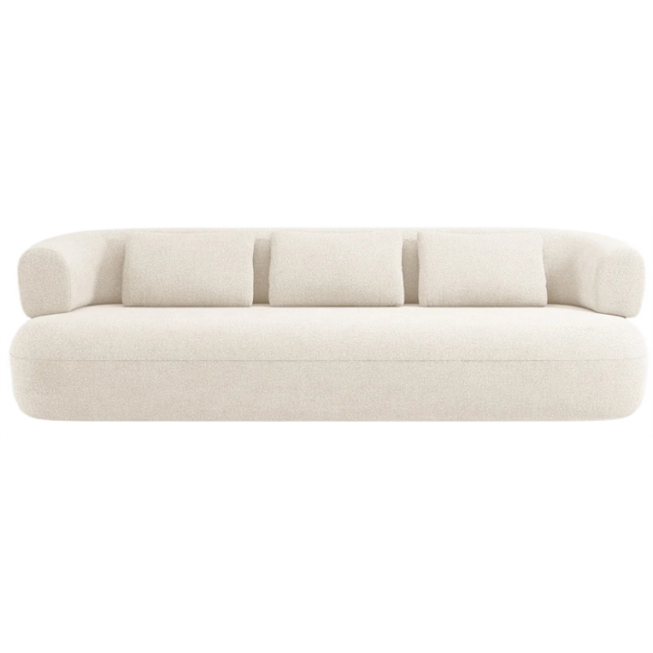 Zaokrąglona sylwetka oraz obłe krawędzie nadają jej nowoczesny wygląd, pasujący do współczesnych trendów opartych na organicznych kształtach. Sofa wyposażona jest w dodatkowe trzy poduszki oparciowe, które zwiększają komfort codziennego wypoczynku. Można je dowolnie układać lub całkowicie zdjąć, aby uzyskać więcej wolnego miejsca na siedzisku, zależnie od aktualnych potrzeb.