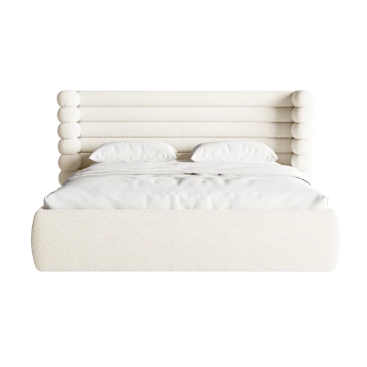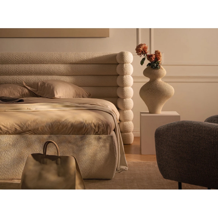 Cechą, która najbardziej przyciąga uwagę, jest wezgłowie o wysokości 120 cm. Zastosowano w nim wyraźne, poziome przeszycia, które nadają mu głęboką strukturę, oraz charakterystyczne panele boczne otulające górną część materaca. Taka forma zagłówka pomaga stworzyć kącik, który odgradza od reszty pomieszczenia i sprzyja wyciszeniu.