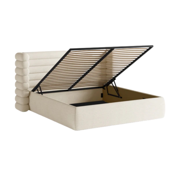 Pod całą powierzchnią materaca ukryto bardzo pojemny schowek, który jest doskonałym miejscem na przechowywanie dodatkowych tekstyliów. Dostęp do środka jest ułatwiony dzięki podnoszonemu stelażowi – wystarczy jeden ruch, aby odsłonić przestrzeń na kołdry, poduszki czy sezonowe ubrania. Pozwala to na lepszą organizację sypialni, bez konieczności dostawiania kolejnych mebli.