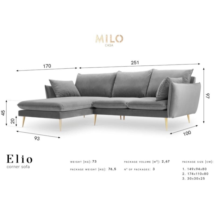 Narożnik 5 os. Elio 251/185 w tk. aksamitnej Milo Casa