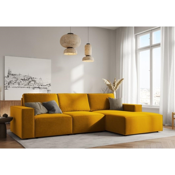 Sofa narożna 4 os. Carlo producenta Milo Casa to mebel o wymiarach: 289 cm szerokości, 90 cm wysokości, 166 cm głębokości, który charakteryzuje się niezwykłą wygodą. Ten modny narożnik jest dostępny w 7 kolorach: Jasny Beżowy, Królewski Niebieski, Szary, Jasny Szary, Żółty, Czarny oraz Butelkowy Zielony, dzięki czemu będzie pasować do każdego rodzaju wnętrz. Wypełnienie siedziska wykonano z połączenia sprężyny falistej oraz pianki poliuretanowej o wysokiej elastyczności, a oparcie wypełniono silikonem. Mebel został obity aksamitną delikatnie połyskującą tkaniną, miłą i przyjemną w dotyku, która zapewnia najwyższy komfort wypoczynku, a dodatkowo jest odporna na ścieranie. Wysokiej jakości materiały wykorzystane do produkcji mebla sprawiają, że sofa narożna Carlo charakteryzuje się dużą wytrzymałością i trwałością. Mebel jest osadzony na niskich, wykonanych z tworzywa nogach. Leżanka może być wyprodukowana z lewej lub z prawej strony, dzięki czemu można lepiej dostosować mebel do swojego mieszkania.