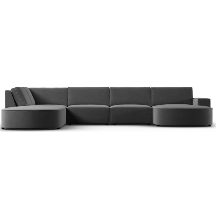 Nowoczesna sofa panoramiczna 5 os. zaokrąglona Carlo producenta Milo Casa to mebel o wymiarach: 368 cm szerokości, 90 cm wysokości, 262 cm głębokości z jednej strony i 160 cm z drugiej strony, który charakteryzuje się niezwykłą wygodą. Ten modny narożnik jest dostępny w 7 kolorach: Jasny Beżowy, Królewski Niebieski, Szary, Jasny Szary, Żółty, Czarny oraz Butelkowy Zielony, dzięki czemu będzie pasować do każdego rodzaju wnętrz. Wypełnienie siedziska wykonano z połączenia sprężyny falistej oraz pianki poliuretanowej o wysokiej elastyczności, a oparcie wypełniono silikonem. Wyróżnikiem sofy jest jej nietypowy, futurystyczny kształt — bryła przypomina kształtem literę „U", dzięki czemu jest doskonałym meblem do spotkań towarzyskich. Sofa została obita aksamitną delikatnie połyskową tkaniną,miłą i przyjemną w dotyku, która zapewnia najwyższy komfort wypoczynku, a dodatkowo jest odporna na ścieranie. Wysokiej jakości materiały wykorzystane do produkcji mebla sprawiają, że sofa panoramiczna Carlo charakteryzuje się dużą wytrzymałością i trwałością. Mebel jest osadzony na niskich, wykonanych z tworzywa nogach. Dłuższa leżanka może być wyprodukowana z lewej lub z prawej strony, dzięki czemu można lepiej dostosować mebel do swojego mieszkania.