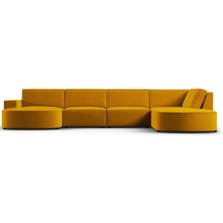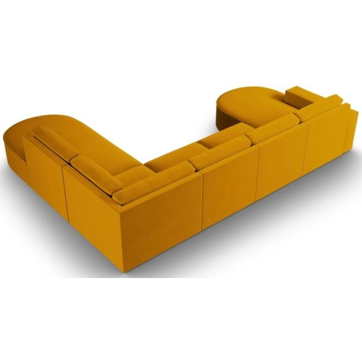 Nowoczesna sofa panoramiczna 5 os. zaokrąglona Carlo producenta Milo Casa to mebel o wymiarach: 368 cm szerokości, 90 cm wysokości, 262 cm głębokości z jednej strony i 160 cm z drugiej strony, który charakteryzuje się niezwykłą wygodą. Ten modny narożnik jest dostępny w 7 kolorach: Jasny Beżowy, Królewski Niebieski, Szary, Jasny Szary, Żółty, Czarny oraz Butelkowy Zielony, dzięki czemu będzie pasować do każdego rodzaju wnętrz. Wypełnienie siedziska wykonano z połączenia sprężyny falistej oraz pianki poliuretanowej o wysokiej elastyczności, a oparcie wypełniono silikonem. Wyróżnikiem sofy jest jej nietypowy, futurystyczny kształt — bryła przypomina kształtem literę „U", dzięki czemu jest doskonałym meblem do spotkań towarzyskich. Sofa została obita aksamitną delikatnie połyskową tkaniną,miłą i przyjemną w dotyku, która zapewnia najwyższy komfort wypoczynku, a dodatkowo jest odporna na ścieranie. Wysokiej jakości materiały wykorzystane do produkcji mebla sprawiają, że sofa panoramiczna Carlo charakteryzuje się dużą wytrzymałością i trwałością. Mebel jest osadzony na niskich, wykonanych z tworzywa nogach. Dłuższa leżanka może być wyprodukowana z lewej lub z prawej strony, dzięki czemu można lepiej dostosować mebel do swojego mieszkania.
