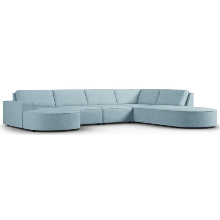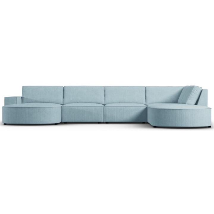 Nowoczesna sofa panoramiczna 5 os.narożna zaokraglona Carlo producenta Milo Casa to mebel o wymiarach: 368 cm szerokości, 90 cm wysokości, 262 cm głębokości z jednej strony i 160 cm z drugiej, który charakteryzuje się niezwykłą wygodą. Ten modny narożnik jest dostępny w 8 kolorach: Beżowy, Jasny Niebieski, Ciemny Niebieski, Szary, Jasny Szary, Żółty, Czarny oraz Butelkowy Zielony, dzięki czemu będzie pasować do każdego rodzaju wnętrz. Wypełnienie siedziska wykonano z połączenia sprężyny falistej oraz pianki poliuretanowej o wysokiej elastyczności, a oparcie wypełniono silikonem. Wyróżnikiem sofy jest jej nietypowy, futurystyczny kształt — bryła przypomina kształtem literę „U", dzięki czemu jest doskonałym meblem do spotkań towarzyskich. Sofa została obita sztruksową matową tkaniną, miłą i przyjemną w dotyku, która zapewnia najwyższy komfort wypoczynku. Wysokiej jakości materiały wykorzystane do produkcji mebla sprawiają, że sofa panoramiczna Carlo charakteryzuje się dużą wytrzymałością i trwałością. Mebel jest osadzony na niskich, wykonanych z tworzywa nogach. Dłuższa leżanka może być wyprodukowana z lewej lub z prawej strony, dzięki czemu można lepiej dostosować mebel do swojego mieszkania.