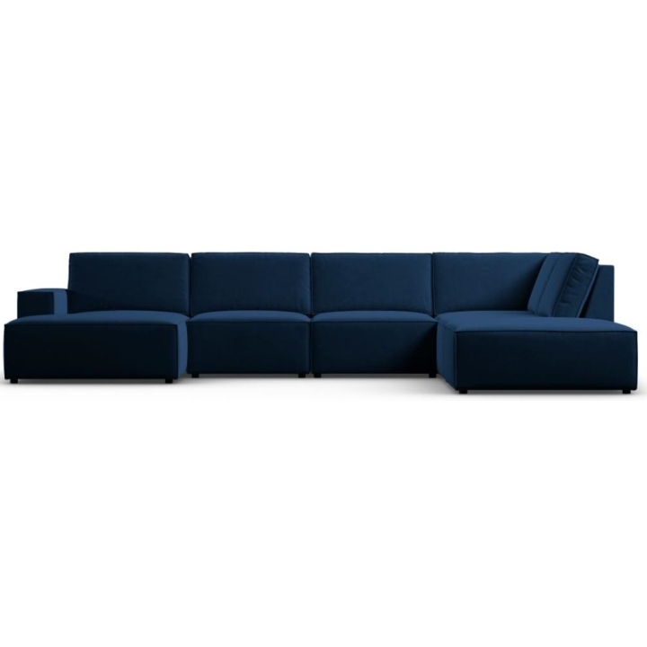 Nowoczesna sofa panoramiczna 7 os. narożna Carlo producenta Milo Casa to mebel o wymiarach: 366 cm szerokości, 90 cm wysokości, 257 cm z jednej strony i 166 cm głębokości z drugiej strony, który charakteryzuje się niezwykłą wygodą. Ten modny narożnik jest dostępny w 7 kolorach: Jasny Beżowy, Królewski Niebieski, Ciemny Niebieski, Szary, Jasny Szary, Żółty, Czarny oraz Butelkowy Zielony, dzięki czemu będzie pasować do każdego rodzaju wnętrz. Wypełnienie siedziska wykonano z połączenia sprężyny falistej oraz pianki poliuretanowej o wysokiej elastyczności, a oparcie wypełniono silikonem. Wyróżnikiem sofy jest jej nietypowy, futurystyczny kształt — bryła przypomina kształtem literę „U", dzięki czemu jest doskonałym meblem do spotkań towarzyskich. Sofa została obita aksamitną tkaniną, jedwabistą  i miękką w dotykuo delikatnym połysku, która zapewnia najwyższy komfort wypoczynku. Wysokiej jakości materiały wykorzystane do produkcji mebla sprawiają, że sofa panoramiczna Carlo charakteryzuje się dużą wytrzymałością i trwałością. Mebel jest osadzony na niskich, wykonanych z tworzywa nogach. Dłuższa leżanka może być wyprodukowana z lewej lub z prawej strony, dzięki czemu można lepiej dostosować mebel do swojego mieszkania.