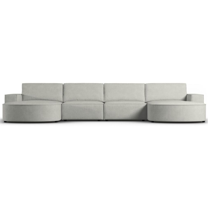 Nowoczesna sofa panoramiczna narożna 5 os. Carlo zaokrąglona producenta Milo Casa to mebel o wymiarach: 372 cm szerokości, 90 cm wysokości, 166 cm głębokości z obu stron, który charakteryzuje się niezwykłą wygodą. Ten modny narożnik jest dostępny w 8 kolorach: Beżowy, Jasny Niebieski, Ciemny Niebieski, Szary, Jasny Szary, Żółty, Czarny oraz Butelkowy Zielony, dzięki czemu będzie pasować do każdego rodzaju wnętrz. Wypełnienie siedziska wykonano z połączenia sprężyny falistej oraz pianki poliuretanowej o wysokiej elastyczności, a oparcie wypełniono silikonem. Wyróżnikiem sofy jest jej nietypowy, futurystyczny kształt — bryła przypomina kształtem literę „U", dzięki czemu jest doskonałym meblem do spotkań towarzyskich. Dodatkowo leżanki zostały zaokrąglone, co czyni ją wyjątkową propozycją. Sofa została obita sztruksową tkaniną o matowej strukturze wykonanej z wąskich pasków o szerokości 3mm, która zapewnia najwyższy komfort wypoczynku. Wysokiej jakości materiały wykorzystane do produkcji mebla sprawiają, że sofa panoramiczna Carlo charakteryzuje się dużą wytrzymałością i trwałością. Mebel jest osadzony na niskich, wykonanych z tworzywa nogach.