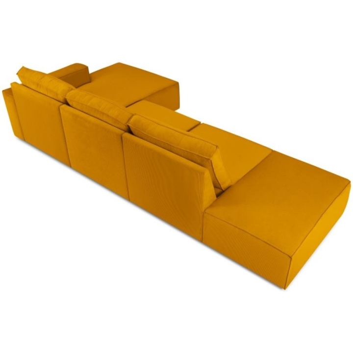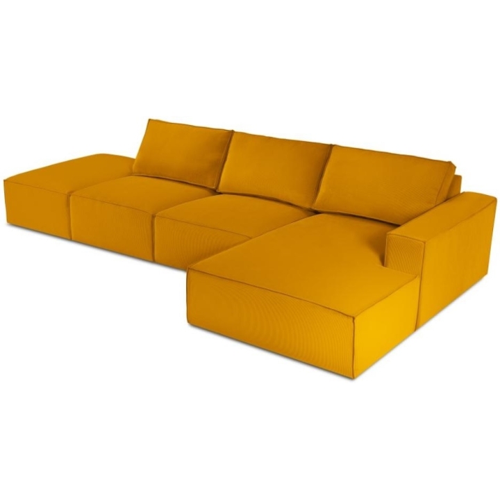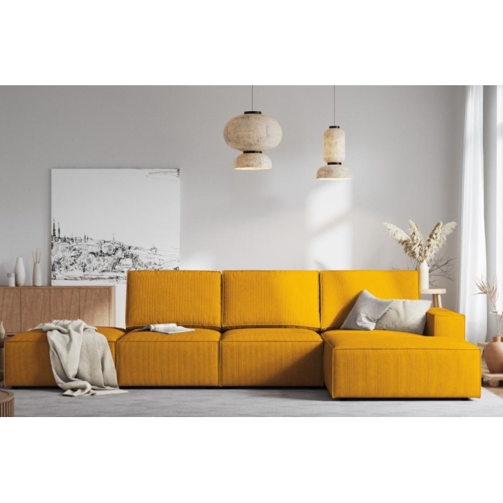 Stylowa sofa narożna 5 os. Carlo producenta Milo Casa to mebel o wymiarach: 341 cm szerokości, 90 cm wysokości, 166 cm głębokości, który charakteryzuje się niezwykłą wygodą. Ten modny narożnik jest dostępny w 8 kolorach: Beżowy, Jasny Niebieski, Ciemny Niebieski, Szary, Jasny Szary, Żółty, Czarny oraz Butelkowy Zielony, dzięki czemu będzie pasować do każdego rodzaju wnętrz. Wypełnienie siedziska wykonano z połączenia sprężyny falistej oraz pianki poliuretanowej o wysokiej elastyczności, a oparcie wypełniono silikonem. Wyróżnikiem sofy jest jej nietypowy, futurystyczny kształt — bryła nie posiada jednego oparcia, dzięki czemu zyskuje na przestronności. Mebel został obity sztruksową tkaniną o matowej strukturze wykonanej z wąskich pasków o szerokości 3mm, która zapewnia najwyższy komfort wypoczynku, a dodatkowo dodaje narożnikowi elegancji. Wysokiej jakości materiały wykorzystane do produkcji mebla sprawiają, że sofa narożna Carlo charakteryzuje się dużą wytrzymałością i trwałością. Mebel jest osadzony na niskich, wykonanych z tworzywa nogach. Leżanka może być wyprodukowana z lewej lub z prawej strony, dzięki czemu można lepiej dostosować mebel do swojego mieszkania.