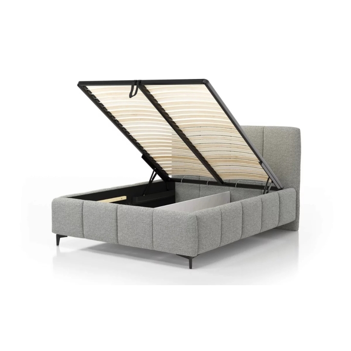 Łóżko wyposażono w wbudowany pojemnik na pościel oraz stelaż na ramie metalowej, co umożliwia efektywne zagospodarowanie przestrzeni. Rozwiązanie to sprawdza się również w pomieszczeniach o ograniczonym metrażu. Przed zakupem zaleca się upewnienie, czy gabaryty produktu pozwalają na jego wniesienie do sypialni.