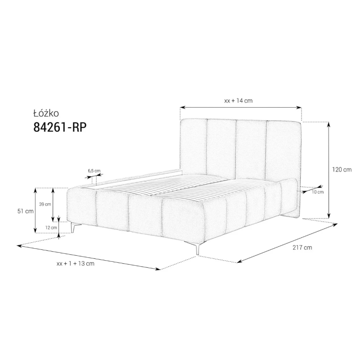 Wymiary zewnętrzne łóżka wynoszą: szerokość 174 cm, wysokość 120 cm oraz głębokość 217 cm, natomiast powierzchnia spania to 160x200 cm. Model dostępny jest także w rozmiarach 120x200, 140x200, 160x200 oraz 180x200. Podane wymiary mogą różnić się o +/- 1 cm, co wynika ze specyfiki materiałów obiciowych i konstrukcji produktu; producent zastrzega możliwość wprowadzenia zmian.