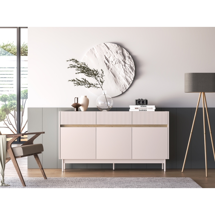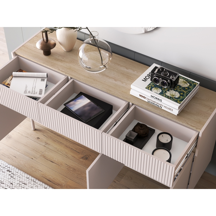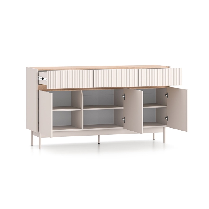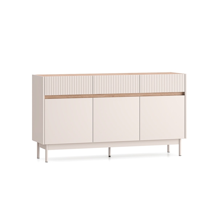Duża komoda Dunea 05 to rozbudowany mebel o szerokości 154 cm, wysokości 85 cm i głębokości 40 cm, zaprojektowany z myślą o przechowywaniu przedmiotów codziennego użytku. Za trzema frontami drzwiowymi znajdują się aż sześć przestronnych wnęk, w których można umieścić ubrania, ręczniki lub zastawę stołową. W górnej części znajdują się trzy szuflady – doskonałe do organizacji drobniejszych elementów, takich jak dokumenty czy tekstylia domowe.
