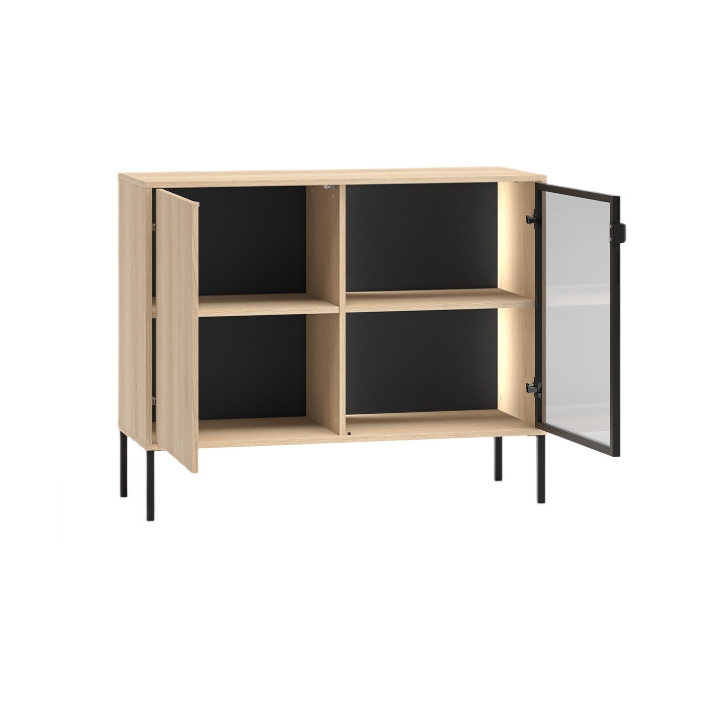 Wnętrze szafki zostało podzielone na dwie sekcje, z których każda wyposażona jest w solidną półkę. Jedna strona posiada pełny front, idealny do ukrycia przedmiotów codziennego użytku, natomiast druga oferuje efektowną ekspozycję za dymionym, hartowanym szkłem w metalowej ramie. W standardzie dołączone jest oświetlenie LED o ciepłej barwie, obsługiwane za pomocą dotykowego włącznika z funkcją regulacji natężenia, co pozwala na stworzenie wyjątkowego nastroju w pomieszczeniu.